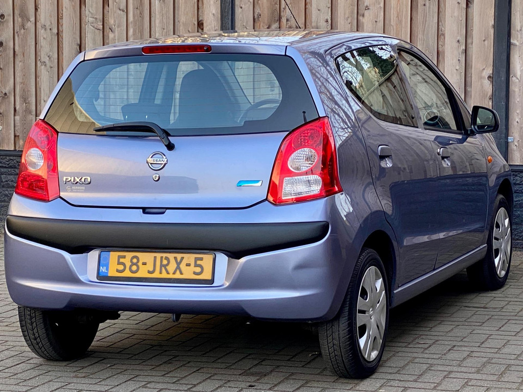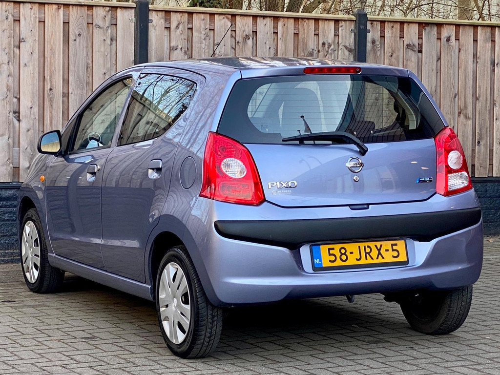 Algemene informatie: Merk: Nissan. Model: Pixo. Type: 1.0 Acenta NL Auto l Airco I APK. Aantal deuren: 5. Technische informatie: Aantal cilinders: 3. Motorinhoud: 996 cc. Aandrijving: Voorwielaandrijving. Acceleratie (0-100): 14,0 s. Topsnelheid: 155 km/u. Maten: Wielbasis: 236 cm. Gewichten: Ledig gewicht: 830 kg. Laadvermogen: 420 kg. GVW: 1.250 kg. Max. trekgewicht: 200 kg (ongeremd 100 kg). Interieur: Aantal zitplaatsen: 4. Milieu: CO₂-uitstoot: 103 g/km. Energielabel: A. Emissieklasse: Euro 5. Verbruik: Gemiddeld brandstofverbruik: 4,4 l/100km (1 op 22,7). Brandstofverbruik in de stad: 5,5 l/100km (1 op 18,2). Brandstofverbruik op de snelweg: 3,8 l/100km (1 op 26,3). Financiële...: