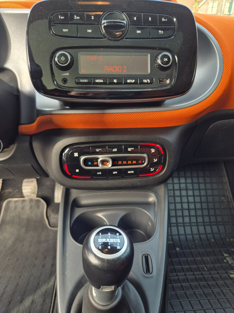 Algemene informatie: Merk: Smart. Model: Fortwo Joy Special Edition !!! BRABUS !!! twee kleur combi Zwart/wit Orange. Type: 1.0 Joy Edition. Aantal deuren: 3. Technische informatie: Aantal cilinders: 3. Motorinhoud: 999 cc. Transmissie: 6 versnellingen, Handgeschakeld. Aandrijving: Achterwielaandrijving. Acceleratie (0-100): 14,4 s. Topsnelheid: 151 km/u. Maten: Wielbasis: 187 cm. Gewichten: Ledig gewicht: 780 kg. Laadvermogen: 370 kg. GVW: 1.150 kg. Interieur: Interieur: Orange, Leder/stof. Aantal zitplaatsen: 2. Milieu: CO₂-uitstoot: 93 g/km. Energielabel: B. Emissieklasse: Euro 6. Verbruik: Gemiddeld brandstofverbruik: 4,1 l/100km (1 op 24,4). Brandstofverbruik in de stad: 4,9 l/100km...