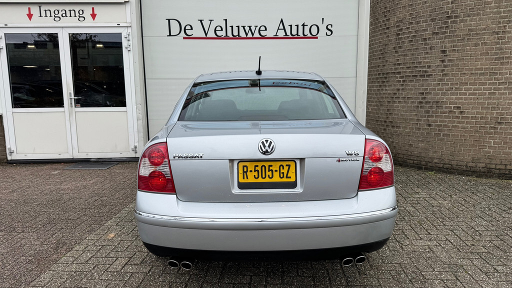 Algemene informatie: Merk: Volkswagen. Model: Passat. Type: 4.0 W8 4Motion |275pk|Leder|Memory|68731km. Carrosserievorm: Sedan. Technische informatie: Aantal cilinders: 8. Motorinhoud: 3.999 cc. Aandrijving: Vierwielaandrijving. Bandenmaat: 225/45 R17. Acceleratie (0-100): 6,5 s. Topsnelheid: 250 km/u. Maten: Wielbasis: 270 cm. Gewichten: Ledig gewicht: 1.650 kg. Laadvermogen: 650 kg. GVW: 2.300 kg. Max. trekgewicht: 2.100 kg (ongeremd 750 kg). Interieur: Interieurkleur: Zwart. Aantal zitplaatsen: 5. Milieu en verbruik: Gemiddeld brandstofverbruik: 13,1 l/100km (1 op 7,6). Emissieklasse: Euro 3. Staat: Aantal sleutels: 2 (2 handzenders). Financiële informatie: Motorrijtuigenbelasting: ...