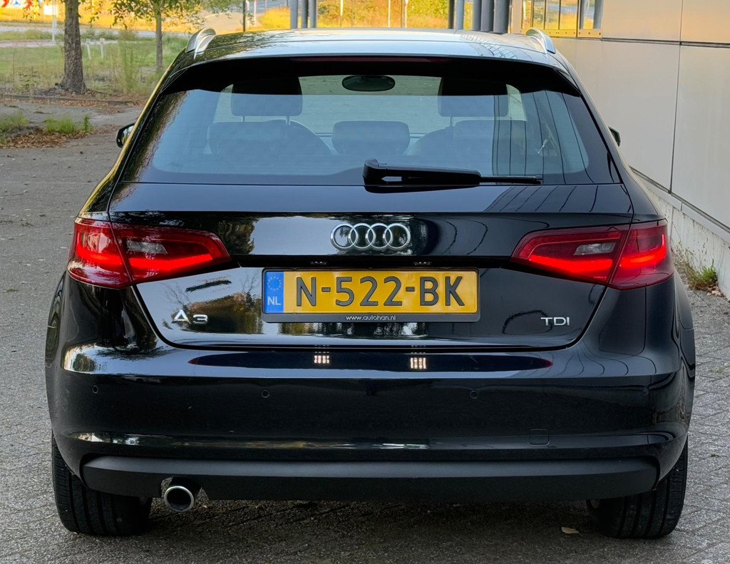 Algemene informatie: Merk: Audi. Model: A3 Sportback. Type: 1.6 TDI S-Line Automaat |Half Leder |Stoelverw |Xenon |Led |Keyless |Nap |Boekjes. Aantal deuren: 5. Technische informatie: Aantal cilinders: 4. Motorinhoud: 1.598 cc. Aandrijving: Voorwielaandrijving. Acceleratie (0-100): 10,9 s. Topsnelheid: 195 km/u. Maten: Wielbasis: 264 cm. Gewichten: Ledig gewicht: 1.255 kg. Laadvermogen: 585 kg. GVW: 1.840 kg. Max. trekgewicht: 1.500 kg (ongeremd 670 kg). Interieur: Aantal zitplaatsen: 5. Milieu: CO₂-uitstoot: 102 g/km. Energielabel: A. Emissieklasse: Euro 5. Verbruik: Gemiddeld brandstofverbruik: 3,9 l/100km (1 op 25,6). Brandstofverbruik in de stad: 4,8 l/100km (1 op 20,8)...