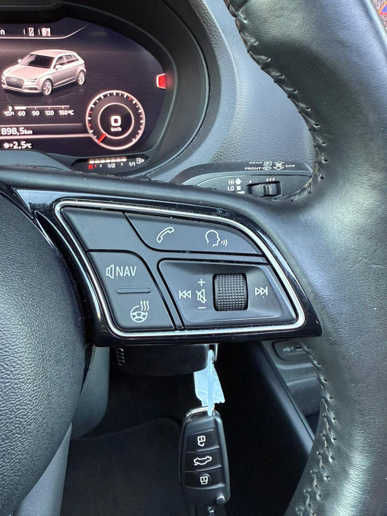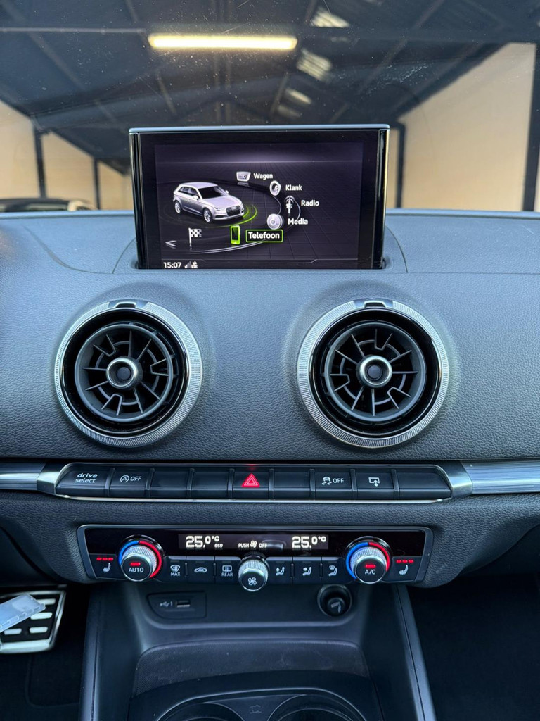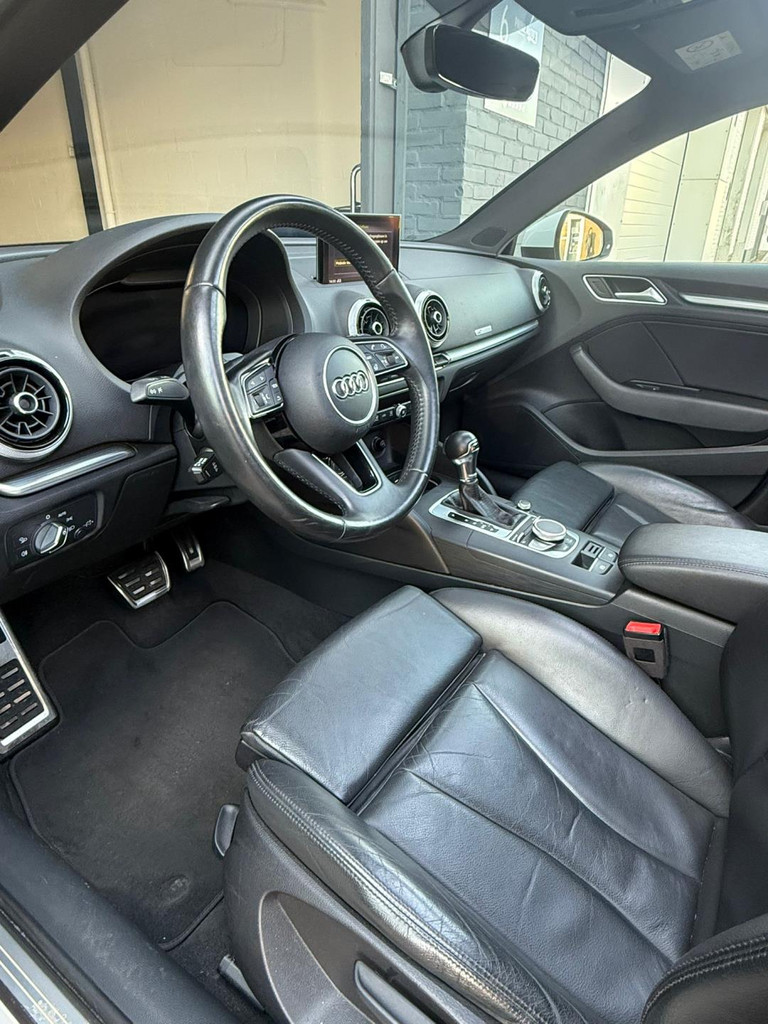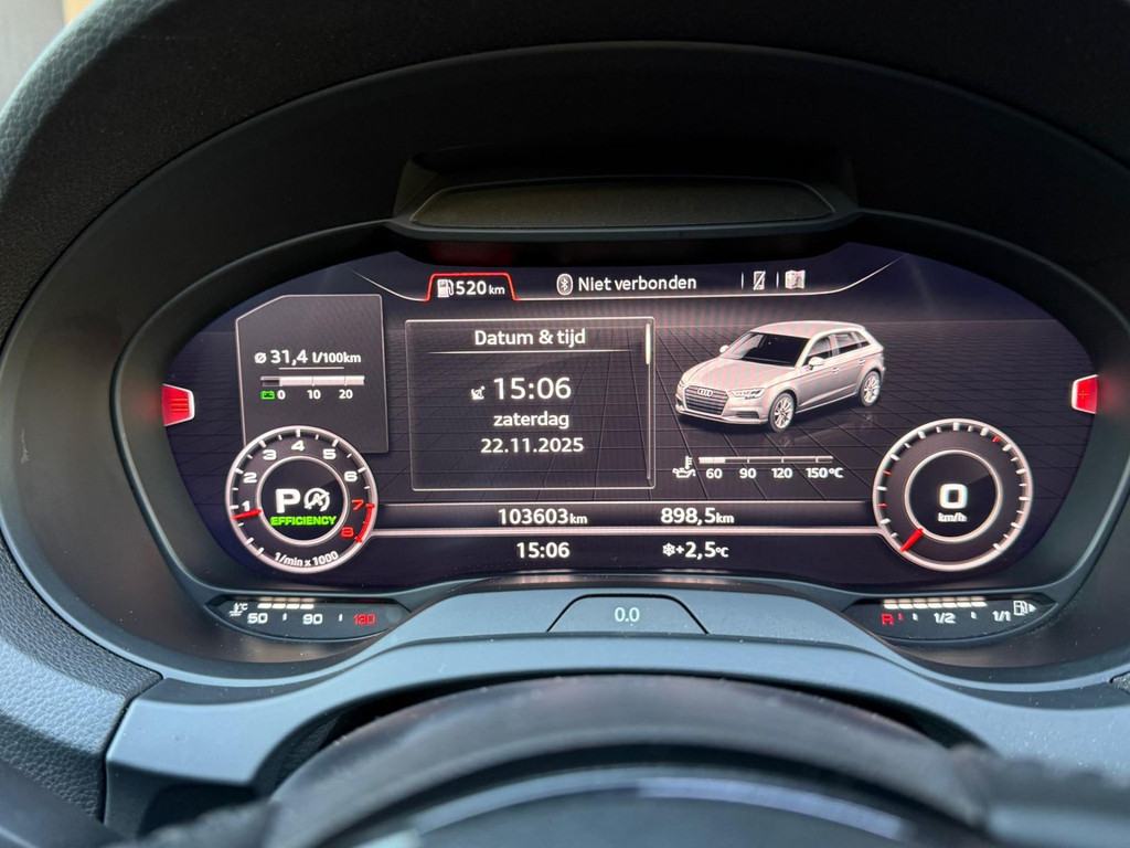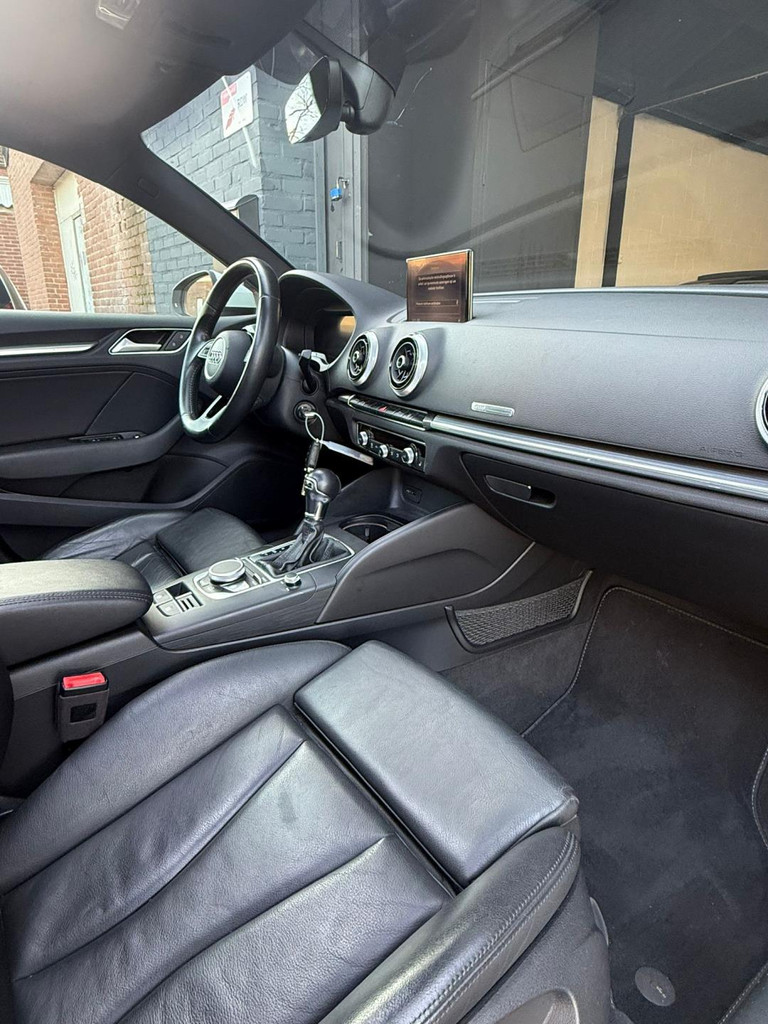 Algemene informatie: Merk: Audi. Model: A3 Sportback. Type: 1.4 TFSI S Line | PANO | DSG | Cruise Control. Aantal deuren: 5. Technische informatie: Aantal cilinders: 4. Motorinhoud: 1.395 cc. Transmissie: 7 versnellingen, Automaat. Aandrijving: Voorwielaandrijving. Bandenmaat: 225/40 R18. Acceleratie (0-100): 8,2 s. Topsnelheid: 220 km/u. Maten: Afmetingen (LxBxH): 431 x 179 x 143 cm. Wielbasis: 264 cm. Gewichten: Ledig gewicht: 1.215 kg. Laadvermogen: 585 kg. GVW: 1.800 kg. Max. trekgewicht: 1.500 kg (ongeremd 650 kg). Interieur: Interieurkleur: Zwart. Aantal zitplaatsen: 5. Milieu: CO₂-uitstoot: 115 g/km. Energielabel: B. Emissieklasse: Euro 6. Verbruik: Gemiddeld brandstofverbruik: 5...