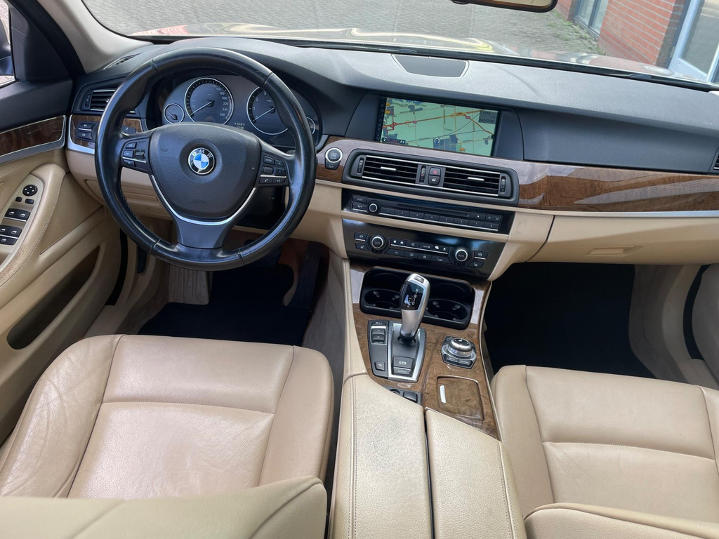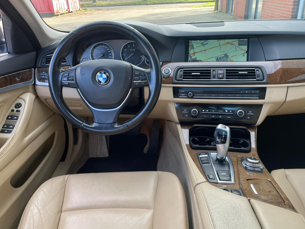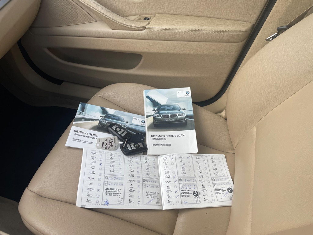 Algemene informatie: Merk: BMW. Model: 5-serie. Type: 520i High Executive Panorama Automaat Leder. Carrosserievorm: Sedan. Technische informatie: Aantal cilinders: 4. Motorinhoud: 1.997 cc. Transmissie: 6 versnellingen, Automaat. Aandrijving: Achterwielaandrijving. Bandenmaat: 225/55 R17. Acceleratie (0-100): 8,0 s. Topsnelheid: 226 km/u. Maten: Wielbasis: 297 cm. Gewichten: Ledig gewicht: 1.585 kg. Laadvermogen: 635 kg. GVW: 2.220 kg. Max. trekgewicht: 2.000 kg (ongeremd 750 kg). Interieur: Interieurkleur: Beige. Aantal zitplaatsen: 5. Milieu: CO₂-uitstoot: 149 g/km. Energielabel: A. Emissieklasse: Euro 5. Verbruik: Gemiddeld brandstofverbruik: 6,4 l/100km (1 op 15,6). Brandstofverbruik...