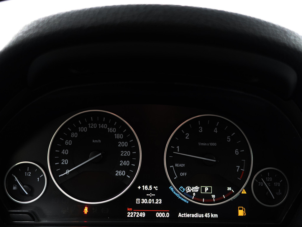 Algemene informatie: Carrosserievorm: Sedan. Modelreeks: mrt. 2012 - aug. 2015. Modelcode: F30. Technische informatie: Koppel: 270 Nm. Aantal cilinders: 4. Motorinhoud: 1.997 cc. Transmissie: 8 versnellingen, Automaat. Tankinhoud: 60 liter. Aandrijving: Achterwielaandrijving. Acceleratie (0-100): 7,3 s. Topsnelheid: 235 km/u. Maten: Afmetingen (LxBxH): 462 x 181 x 143 cm. Wielbasis: 281 cm. Gewichten: Ledig gewicht: 1.395 kg. Laadvermogen: 575 kg. GVW: 1.970 kg. Max. trekgewicht: 1.500 kg (ongeremd 695 kg). Interieur: Interieurkleur: Zwart. Aantal zitplaatsen: 5. Milieu: CO₂-uitstoot: 138 g/km. Energielabel: A. Emissieklasse: Euro 6. Verbruik: Gemiddeld brandstofverbruik: 5,9 l/100km (1...