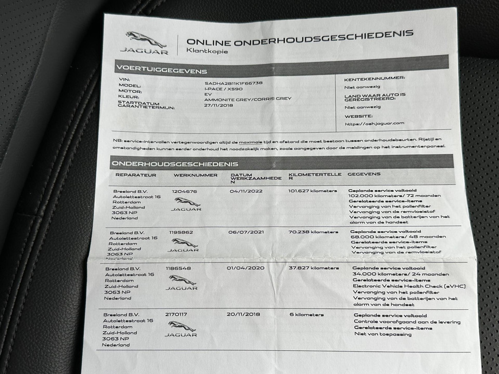 Prijs: €15.950 EUR Merk: Jaguar Model: Jaguar I-PACE EV400 S 90 kWh Leer Navi Camera Carplay Pano Bouwjaar: 2018 kilometerstand: 160225 Brandstof: Electrisch Carrosserie: SUV Kleur: Grijs Transmissie: automatic Kenteken: XB-143-S Registratie tot: 2026-11-30 BTW/Marge: Marge